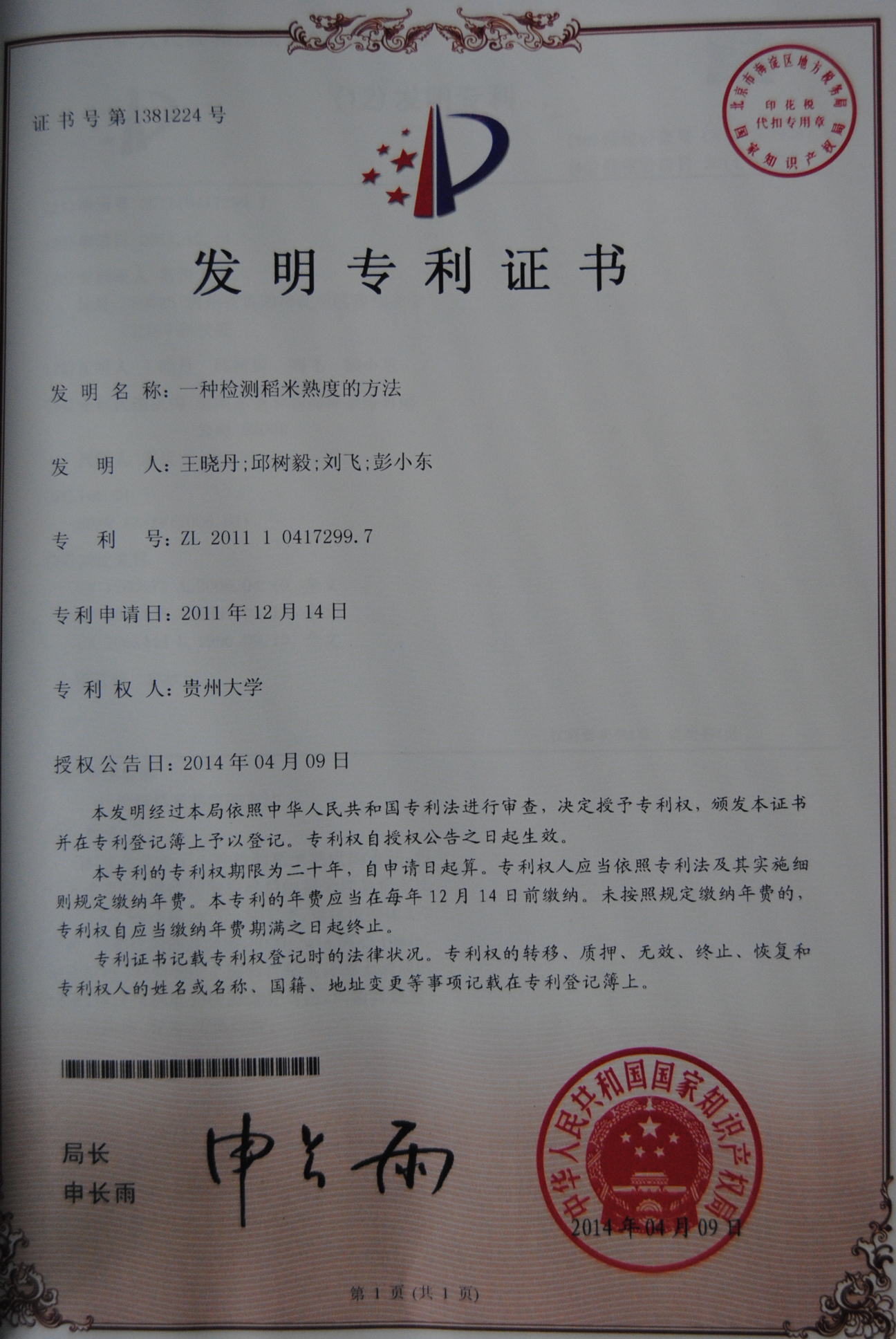 专利名称:一种检测稻米熟度的方法,专利号:ZL 2011 1 0417299.7