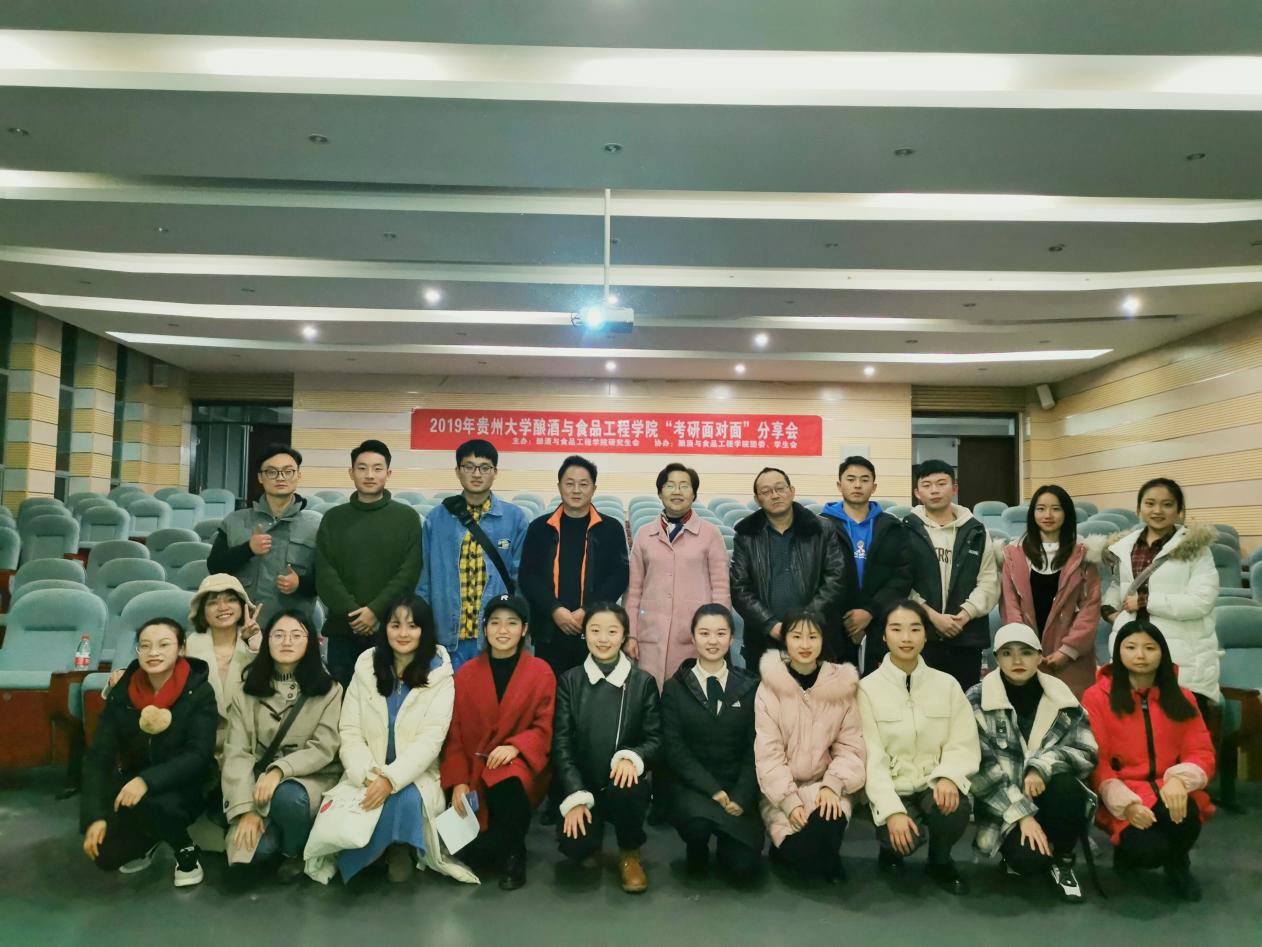 酿酒与食品工程学院讯(文字 余晶晶 摄影 代晓桐)为了更好指导本科生的考研工作,帮助更多本科生圆考研梦,2019年11月27日下午19:00,由酿酒与食品工程学院研究生会与本科团委、学生会联合举办的考研分享会,在贵州大学西楼305报告厅举行。本次活动作为我院扎实推进“不忘初心,牢记使命”的主题教育,本着为同学们服务解难题的宗旨,帮助同学们明确学习方向及目标,激发同学们考研热情。出席本次分享会的领导老师有酿酒与食品工程学院党委副书记尹晓莉老师、副院长谭书明教授、研究生科吴晓菲老师,以及酿酒与食品工程学院17级、18级学生代表。本次分享会由研究生会副主席郭雪峰主持。