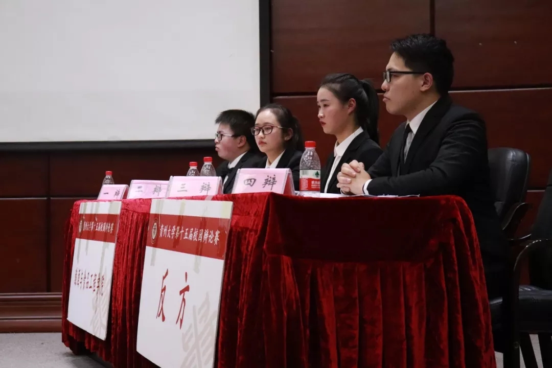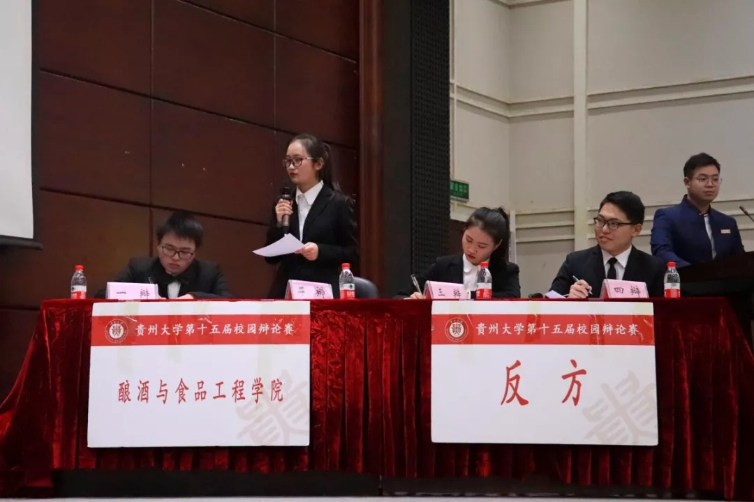 酿酒与食品工程学院讯(张娜娜 报道|摄影 向诗秀)“当代大学生是更应该培养自豪感,还是更应该培养危机感?”面对这样的话题,如果你持一方观点,你该如何论证你的观点并驳斥对方的观点?真实的辩论发生在2019年12月12日晚上的“贵州大学第十五届校园辩论赛”冠亚军的巅峰对决中。我院辩论队持反方观点“当代大学生更应该培养危机感”,经济学院辩论队持正方观点“当代大学生更应该培养自豪感”。经过一个小时的“你来我往”,最终我院辩论队胜出夺冠!此次决赛辩手有四位,他们分别是: