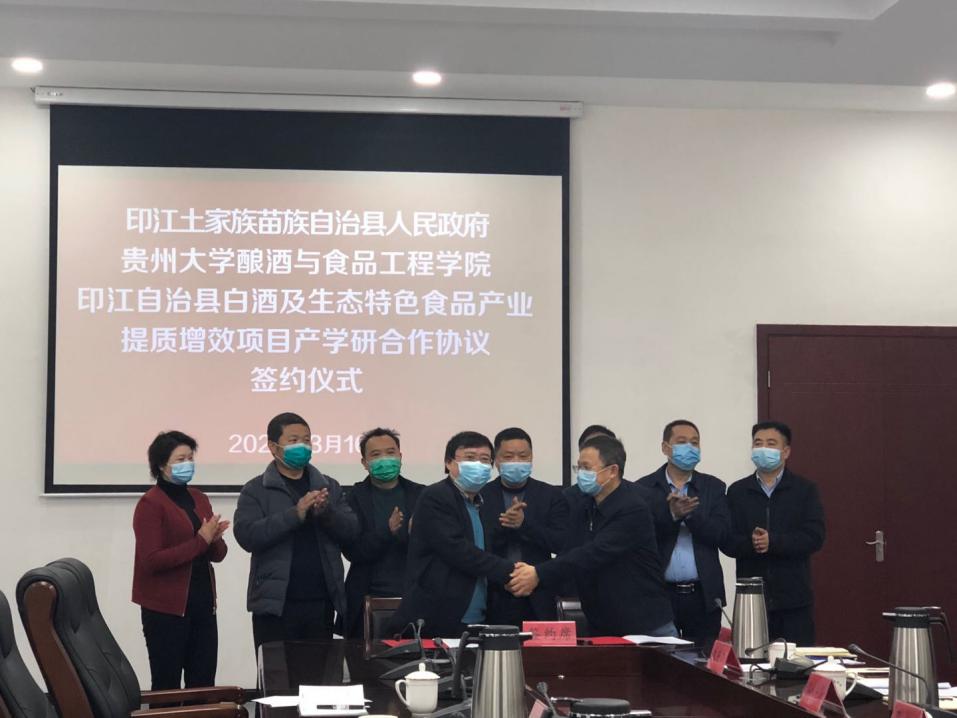 酿酒与食品工程学院讯(周鸿翔 报道|摄影 周鸿翔)2020年3月18日,受印江县政府邀请,贵州大学酿酒与食品工程学院邱树毅、秦礼康、胡鹏刚、周鸿翔老师一行到印江县调研当地白酒、食用菌、特色食品产业,与印江县政府、县相关职能部门、乡镇负责人及食品加工企业的负责人进行了座谈交流,并与印江县政府签署了战略合作协议。