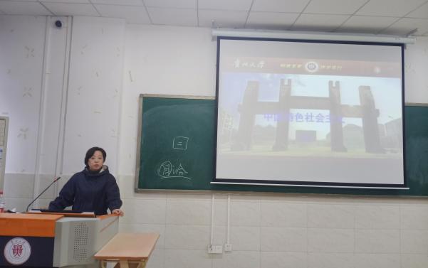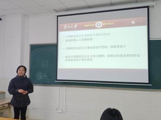 紧接着,于老师谈到:中国特色社会主义伟大旗帜是历史和人民的选择,并指出中国特色社会主义伟大旗帜不仅是当代中国发展进步的旗帜,更是全党全国各族人民团结奋进的旗帜。之后,于老师又详细介绍了社会主义道路的提出、中国特色社会主义道路的科学内涵、中国特色社会主义理论体系的两次飞跃等内容。她强调:在新的历史条件下夺取中国特色社会主义新胜利,并使之成为全党全国各族人民的共同信念要依靠“八个必须坚持”。