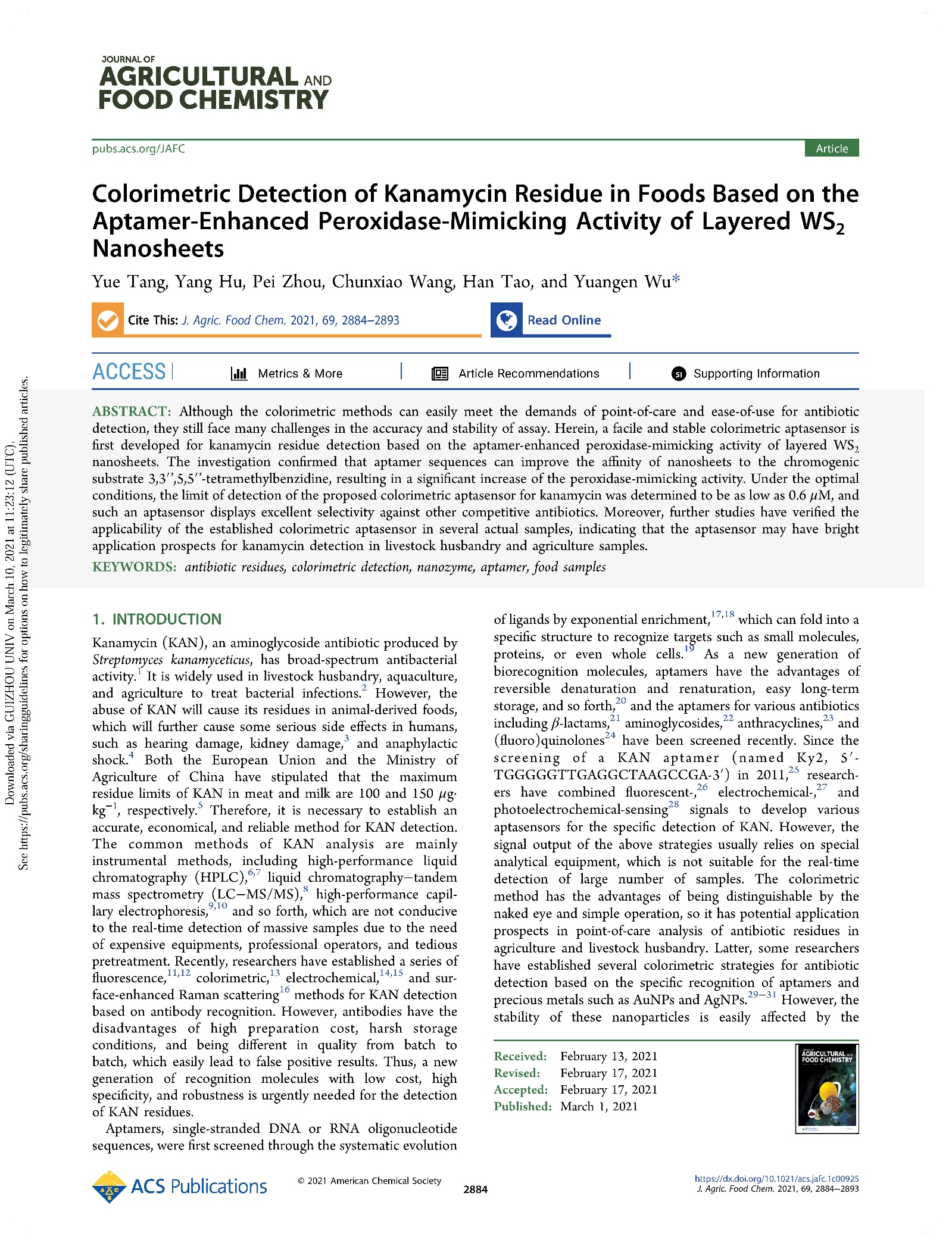 我院吴远根教授领衔的食品安全检测课题组,最近通过核酸适配体调控二硫化钨纳米片的过氧化物模拟酶活性,构建了一种能灵敏和快速比色检测食品中卡那霉素残留的新方法,相关成果于2021年3月1日发表在Journal of Agricultural and Food Chemistry (JAFC)期刊上。JAFC由美国化学学会(ACS)出版,是食品科学和农林科学领域的国际权威期刊,最新影响因子为4.192 (2019年),在中科院基础版和升级版的大类分区中均列为1区。