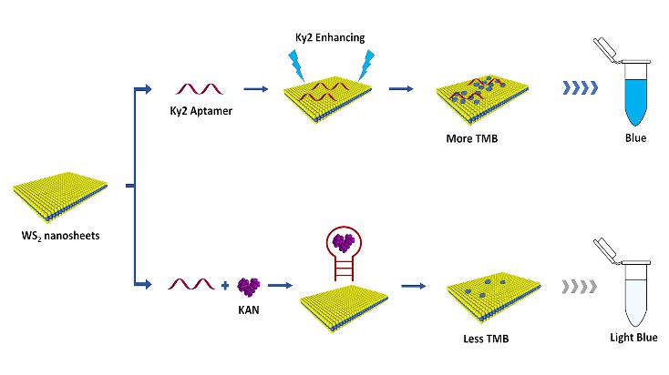 该课题组深入研究了二维纳米片、核酸适配体和卡那霉素之间的相互作用机制,发现核酸适配体中的鸟嘌呤碱基对二硫化钨过氧化物模拟酶活性具有显著增强效应。该研究将核酸适配体的特异性识别能力和纳米酶的催化调控有效结合,构建了适用于食品危害物检测的通用平台,为其它纳米酶生物传感器的设计提供了新思路。
