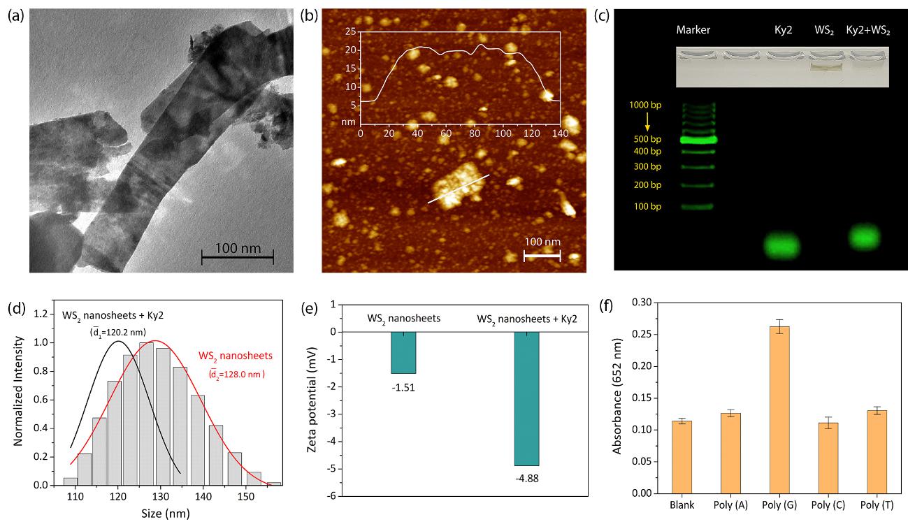 WS2纳米片的TEM图像(a)和AFM图像(b);(c)Ky2适配体与WS2纳米片相互作用的琼脂糖凝胶电泳研究;(d) 添加Ky2适配体前后WS2纳米片平均粒径的变化;(e)添加Ky2适配体前后Zeta电位的变化;(f)核酸碱基组成对WS2纳米片过氧化物酶活性的影响。