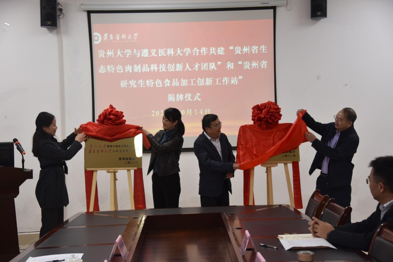 随后,凌琦书记和李红副书记,邱树毅院长和李岩院长为贵州大学与遵义医科大学合作共建“贵州省生态特色肉制品科技创新人才团队”和“贵州省研究生特色食品加工创新工作站”揭牌。