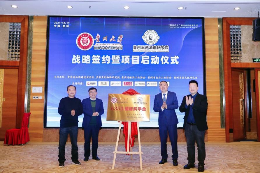 在签约仪式现场,还举行了“贵州王茅酒曲研究联合实验室”和“6353德馨奖学金”揭牌仪式,双方将在产学研合作的基础上聚焦于王茅酒曲的功能作用、微生物系统组成、呈香呈味物质机理等深层次问题开展研究,同时着力于酱香白酒生产的人才培养,体现双方的社会责任和担当。