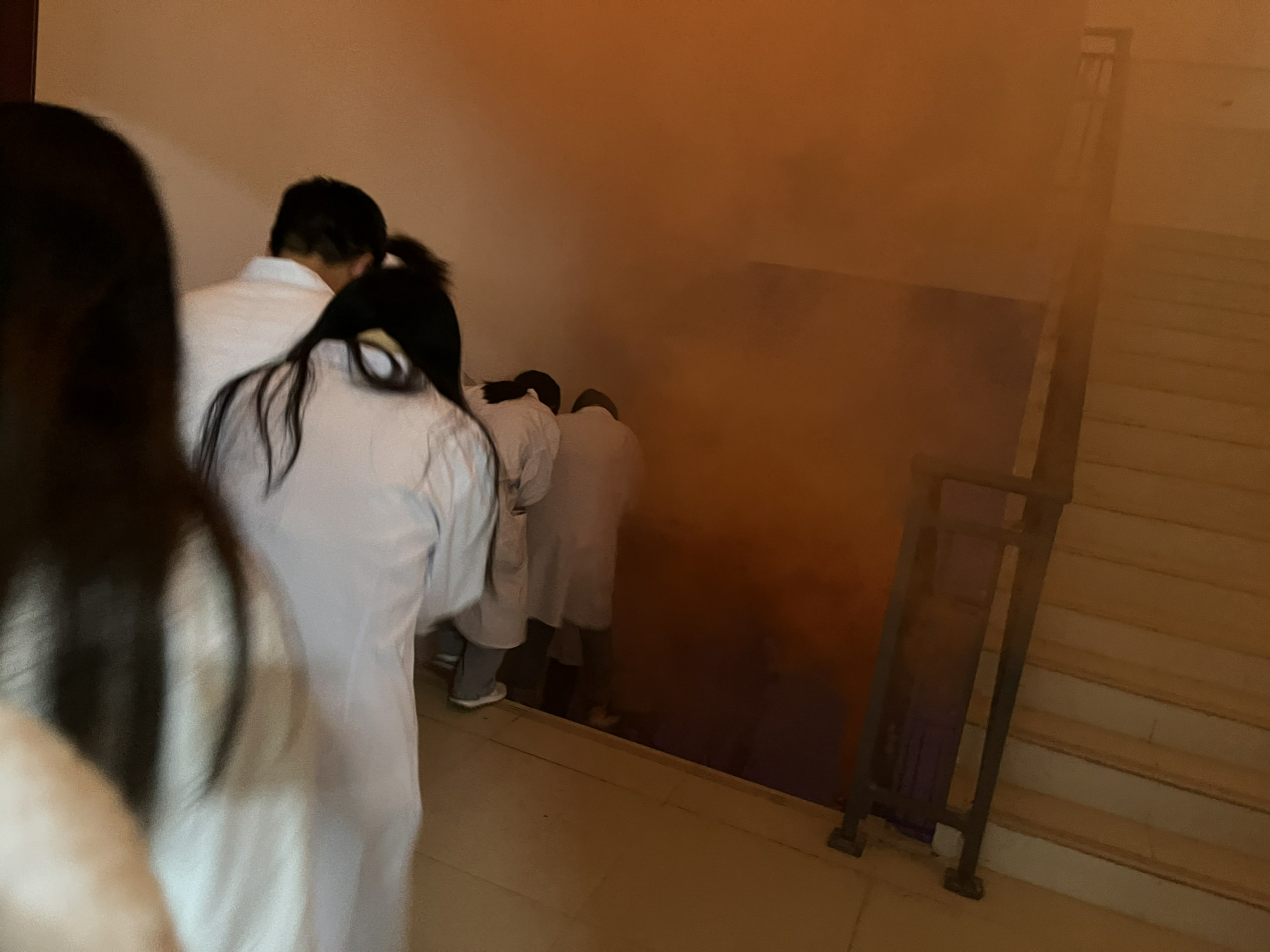 最后,学院师生进行烟雾逃生帐篷演练,帐篷只有进出两个门口,里面漆黑一片,帐篷里制造出大量对人体无害的浓烟。在没有照明、浓烟密布的情况下,学院师生“逃”出火灾现场。通过模拟火灾逃生帐篷的演练,不仅演练了用湿毛巾捂上口鼻,低下身体逃离火场的技能,还体验到了着火时自身慌乱的情绪该如何应对处理。