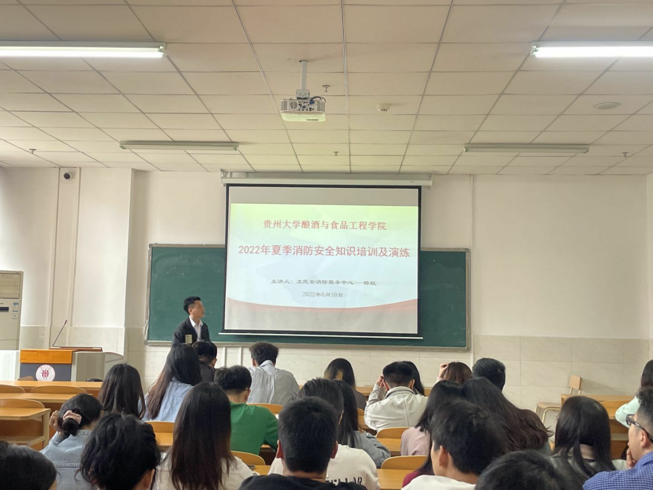 为深入贯彻《中华人民共和国消防法》、《消防安全责任制实施办法》、《贵州省消防条例》和《国务院安委会办公室、应急管理部关于开展2022年全国“安全生产月”活动的通知》。根据《贵州大学“打非治违”工作实施方案》的指导,为加强学院消防安全管理工作,进一步提高防火用电安全和学院师生的消防安全意识,2022年6月10日,贵州大学酿酒与食品工程学院邀请了贵州卫民安消防服务中心消防宣传教员高广云和杨跃进行消防培训和演练。