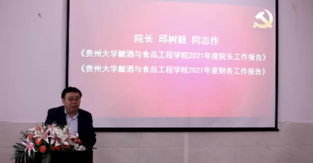 院长邱树毅作《贵州大学酿酒与食品工程学院2021年度工作报告》、《贵州大学酿酒与食品工程学院2021年度财务工作报告》。邱院长在工作报告中就2021年学院工作做了全面的总结。强调学院在师德师风建设、学生管理、人才引进、一流学科建设,酿酒工程专业认证和博士点申报等工作方面做出的努力和取得的成绩,指出了学院下一步发展方向。