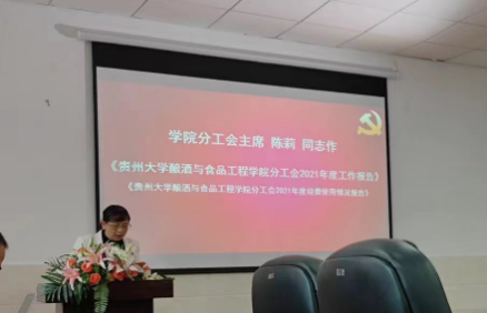 学院分工会主席陈莉同志作《贵州大学酿酒与食品工程学院分工会2021年度工作报告》、《贵州大学酿酒与食品工程学院分工会2021年度经费使用情况报告》。陈莉主席表示,2021年院分工会在领导以及工会成员的支持下,牢固树立用心服务教职工的理念,紧紧围绕学院中心工作,在团结引领广大教职工坚持立德树人,积极参政议政,开展群众性活动等方面发挥了积极作用,也指出了工作中存在的不足。院工会将积极探索工作的新思路、新途径,创造性地开展好工会工作,多开展有利于教职工职业发展和身心健康的活动,团结和动员广大教职工齐心协力、锐意进取,为学院的高质量发展而努力奋斗!