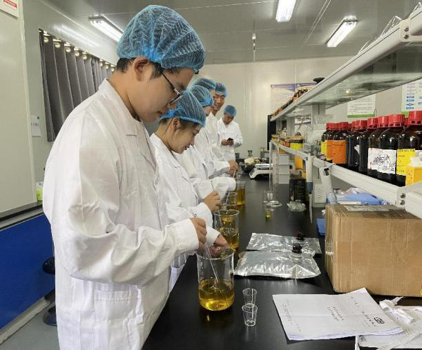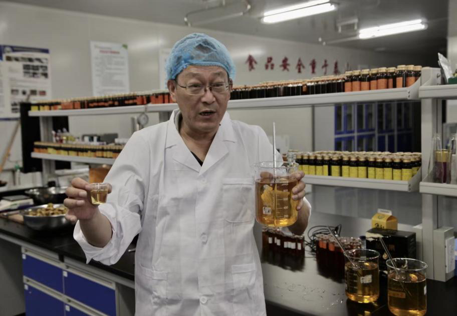 最后,费经理表示,因刺梨中含有丰富的VC、VP以及SOD等营养素,因此鲜榨的刺梨汁带有酸、涩、苦等味道,很难被人们所接受。而对刺梨原汁的调配过程中,无法把控好刺梨涩味调和的关键。因此,在费经理的邀请下,我们来到了恒力源集团的实验室,在贵州大学酿酒与食品学院副院长谭书明的指导下,我们对鲜榨刺梨果汁进行了口感调配。经过调配后的鲜榨刺梨原汁酸、涩、苦味均得到了改善,且也最大程度保留了鲜榨刺梨汁原有的香味及营养成分。