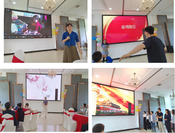 接下来进行的“心有灵犀”环节,每个部门选派两位选手上场,一个比划一个猜,经过激烈角逐,最终院行政组的胡可老师、闫岩老师表现最佳。之后进行的是新进老师才艺表演,食品科学与工程教研室的齐琦老师表演了古典舞《玉生烟》,伴随着优美的音乐,齐琦老师翩翩起舞,舞姿轻盈灵动,把现场观众带入到一种清新典雅的意境中;学院曾祥勇、罗游、宋晓燕、宋昂芯、曾露、周剑丽、谭红霞等几位新进老师一起合唱了歌曲《歌唱祖国》,激昂动人的旋律点燃了在场老师们的爱国热情,大家一起加入合唱,嘹亮的歌声在会场上空回荡。