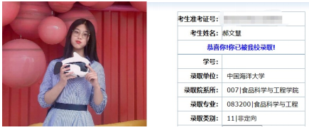 郝文慧,女,2001年8月生,山西孝义人,中共党员。在校期间,曾担任院网络文化工作室副主编。曾先后获得校三好学生两次、校三等奖学金两次、挑战杯校级三等奖、校优秀团员干部、院优秀学生干部等奖励。现已通过全国大学生四、六级考试和教师资格证考试,并成功考取中国海洋大学食品科学与工程专业研究生。