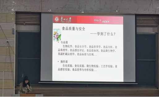 首先进行分享的是食安191班李春雁学姐,她将她的学业生活总结为“始于热爱,终于坚持,成于热爱”。她带大家了解学科大类,分享专业乐趣,展示丰富的课余生活。学姐说不同的老师不同的专业,课堂汇报的内容和对其要求也不同,或是组队制作PPT,或是拍微视频,或是收集食品安全事件。为了锻炼大家的胆量,增加实践知识,学姐还强烈推荐同学们参加各种挑战杯、大学生生命科学竞赛、互联网+等一些有意义的比赛项目。最后李春雁学姐说:“未来可期,前程似锦,祝你们也祝我们!”