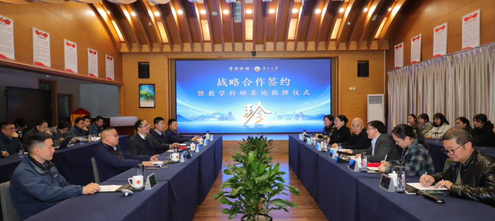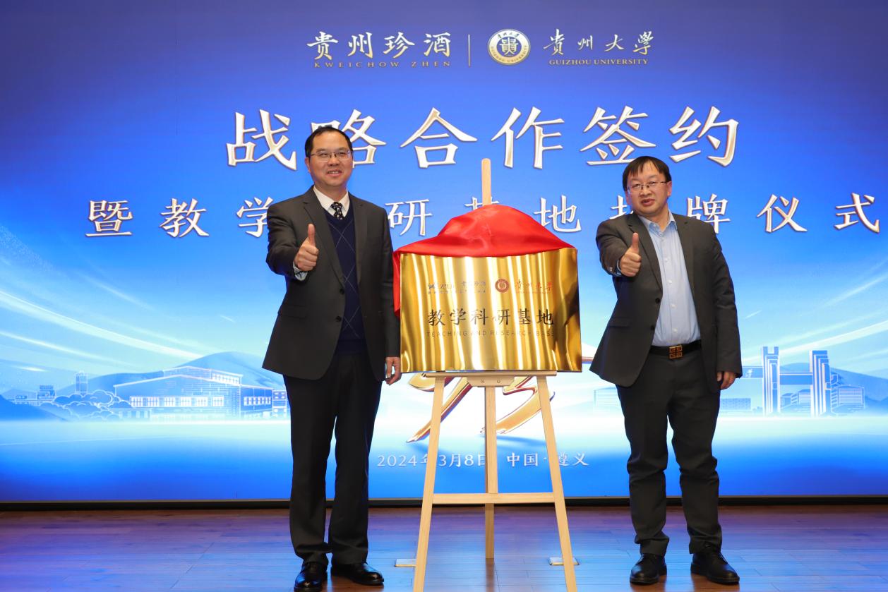 2024年3月8日,贵州大学与贵州珍酒酿酒有限公司战略合作签约暨教学科研基地揭牌仪式在贵州珍酒酿酒有限公司石子铺老厂区办公楼会议室举行。贵州大学对外合作处副处长黄剑、酿酒与食品工程学院院长黄永光,贵州珍酒酿酒有限公司总经理朱国军,副总经理李银强、吴长贵、唐绍培、王振林等双方领导出席会议;贵州大学酿酒工程专业负责人王春晓、吴鑫颖,贵州珍酒酿酒有限公司相关部门负责人及贵州大学教师、学生代表参会见证。