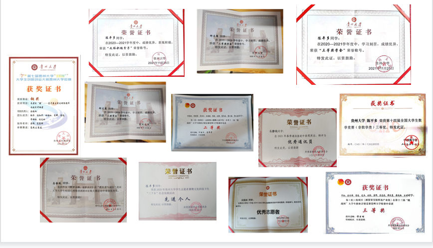 在校期间,曾担任院学生会学习部部长,院网络文化工作室摄影部副部长等职务。曾先后获得校“优秀志愿者”、院学生会“优秀干部”等称号。同时,在学习之余还曾参与过1项互联网“+”比赛,主持过1项挑战杯大赛,并先后获得互联网“+”校级铜奖及挑战杯校级二等奖的荣誉。现已通过全国大学生英语四级考试,并成功考取贵州大学食品科学专业研究生。