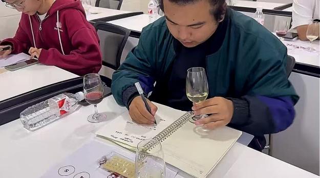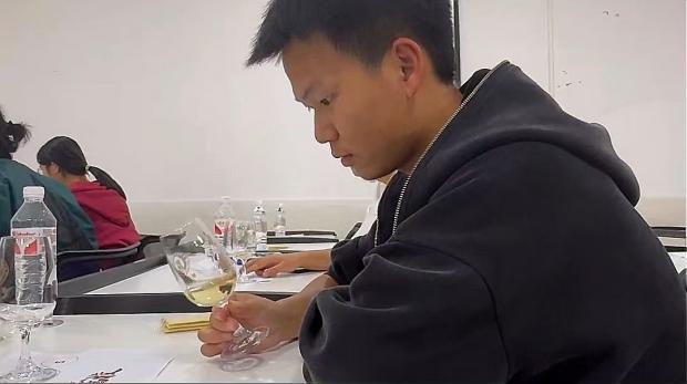 贵州大学酿酒工程专业本科生刘应保同学评价交流第六款酒:“这款冰白葡萄酒入口香甜,香气独持怡人,酒体清爽可口,回味带有浓郁的果香,给人带来愉悦的感觉”。