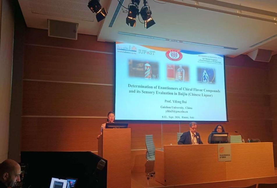 近期,贵州大学酿酒与食品工程学院在新加坡国立大学访学的教师戴怡凤教授受邀参加了在意大利里米尼举办的第22届国际食品科学与技术联盟(International Union of Food Science and TechnologyIUFoST)世界食品科技大会(22nd World Congress of Food Science and Technology),并围绕“Determination of Enantiomers of Chiral Flavor Compounds and its Sensory Evaluation in Baijiu (Chinese Liquor)”专题进行了口头报告。戴怡凤教授在大会上介绍了中国白酒中手性风味化合物对映异构体的相关研究,向世界展示了中国白酒,展示了贵州大学酿酒与食品工程学院良好的国际形象。