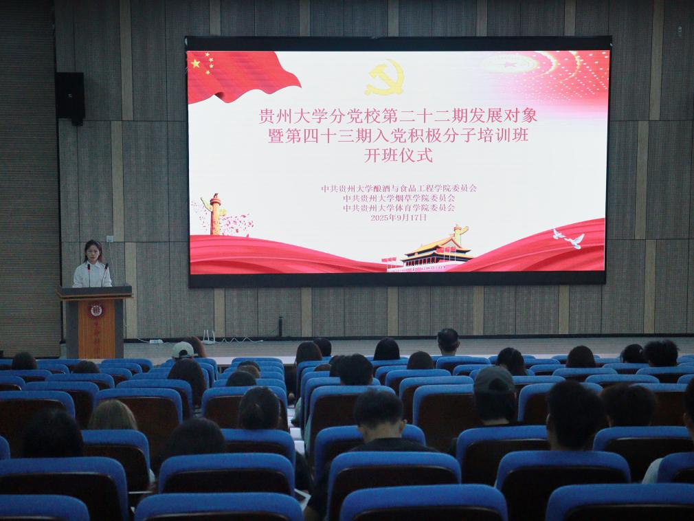 9月17日,贵州大学酿酒与食品工程学院、烟草学院、体育学院分党校第二十二期发展对象暨第四十三期入党积极分子培训班开班仪式在崇德楼104报告厅联合举办。分党校校长、酿酒与食品工程学院党委书记凌琦,体育学院正处级组织员陈朝东,酿酒与食品工程学院副处级组织员王瑶,及全体学员参加开班仪式。开班仪式由分党校班主任邹丽平主持。